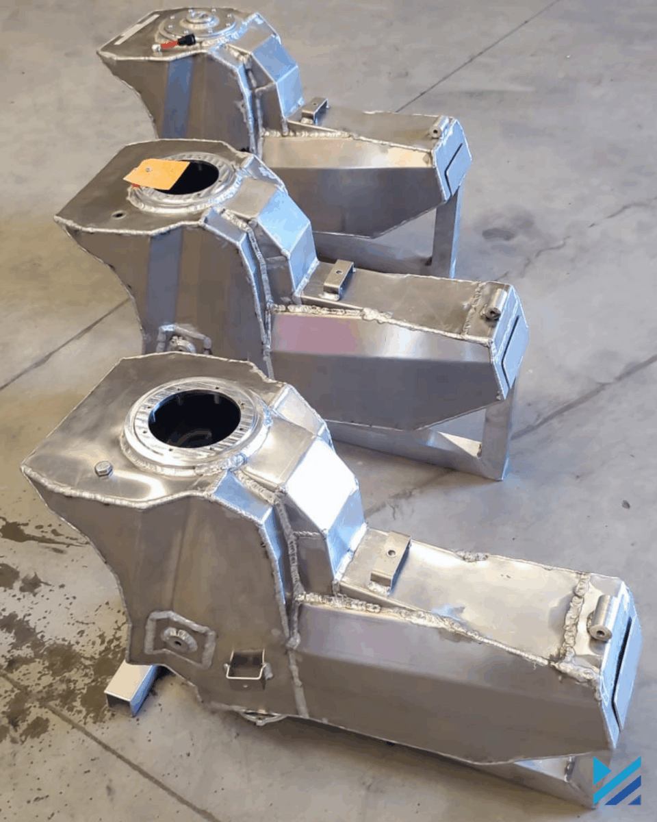 Fabrication de trois réservoirs de carburant moto Kawasaki d’endurance pour les 24h du Mans pour le team ORS. Mise en forme, pliage, soudure TIG alu, essai d’étanchéité.