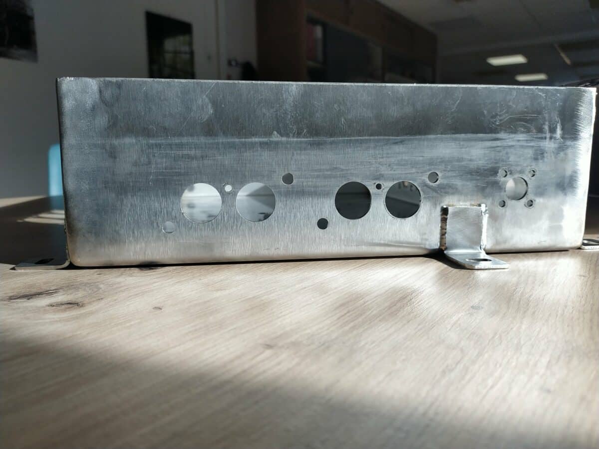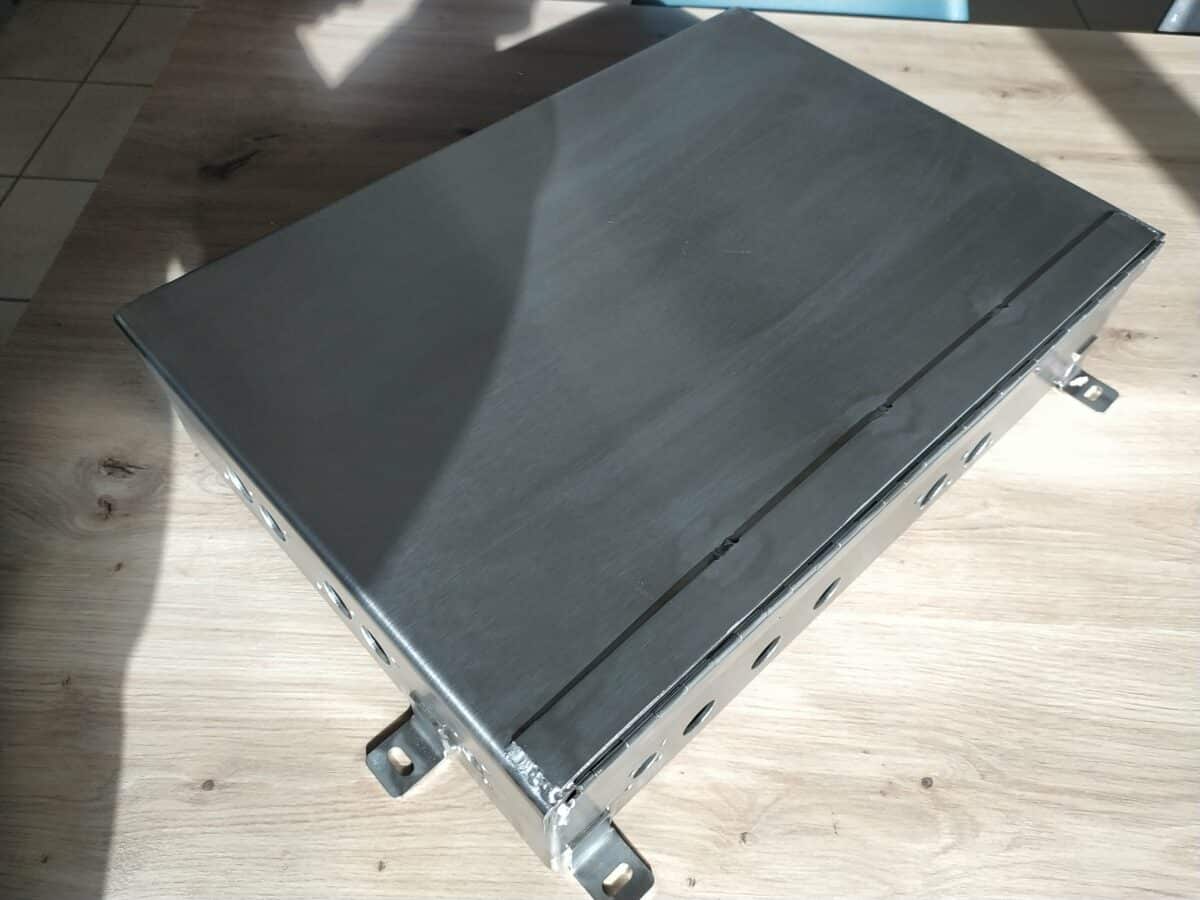 Fabrication d’un boitier en inox brossé epaisseur 2mm pour le montage de composants électriques d’un aéronef.
